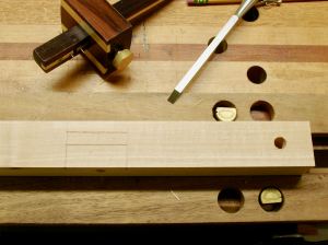 For a drawer this small I’m putting a straight dado in the sides for the back. For larger drawers in a piece of furniture it’s better to cut a sliding dovetail to stabilize the back. Decided to use a backsaw, chisels, and my old Stanley 271 Router. I use the router to scribe the line for the depth on the edge.