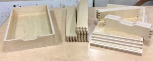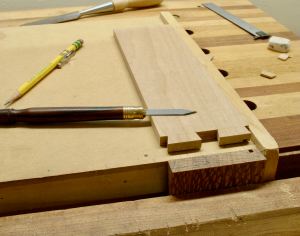 Now comes the pin board or drawer front in this case. I choose Australian Lacewood for this and honestly, it’s like cutting concrete! The time proven method is to support the board on your plane, line up the pieces and scribe the lines. It’s essentially an L-shaped piece with a fence on one side. That fence aligns the side and front squarely. Then the step cut at the front of the side locks tightly for scribing. Always scribe rather then using a pencil, the scribed line gives you something to register your chisel into. Cutting half blind dovetails is process you need to practice and discover for yourself how to manipulate your chisels and saws. Important of course to mark what needs to be removed and cut on the waste side. Take your time and remember it’s hard to replace wood if you go too far! It’s all a learning experience and I keep on learning for sure!